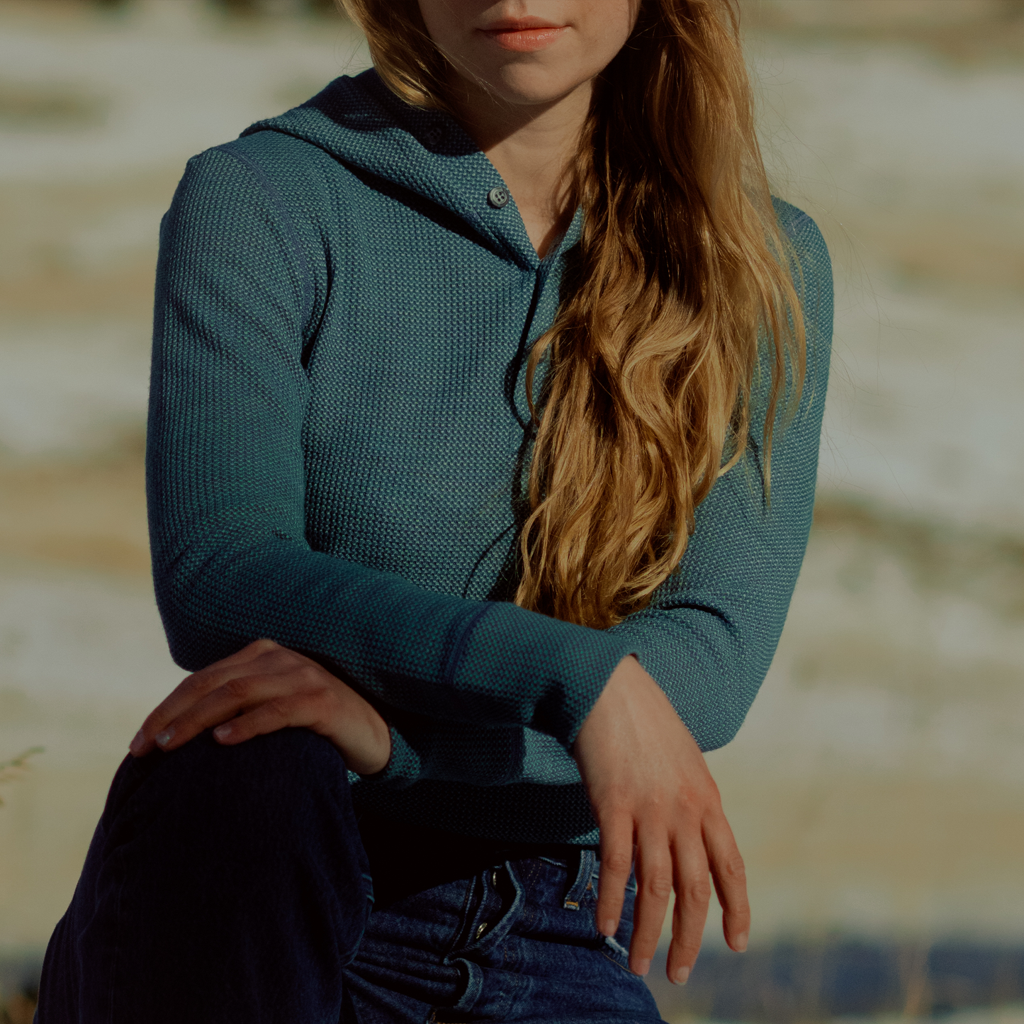 A waffle knit henley hoody, unmatched comfort.